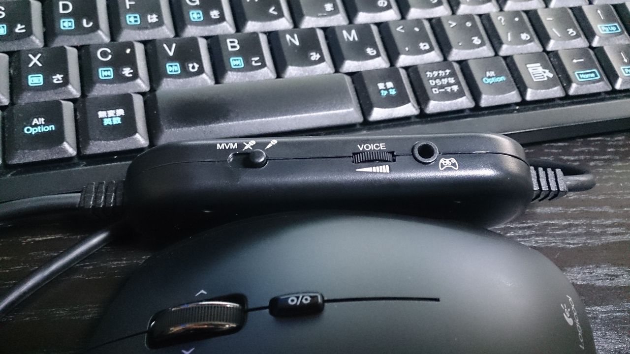MVMと書いてあるスイッチは真ん中でミュート、右でマイクオン、左側にするとマイクオンにしつつヘッドフォンからも自分の声が聞こえるようになります