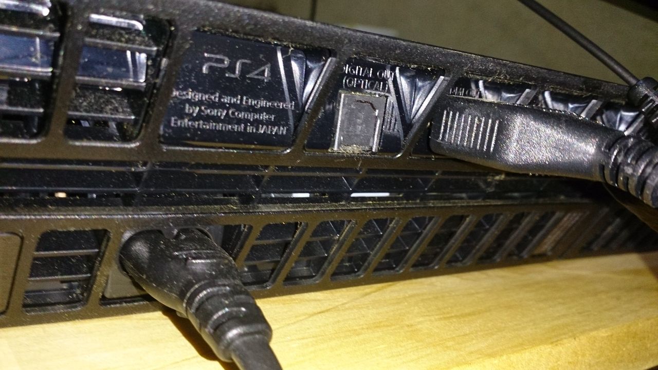 で、PS4の裏側にある光デジタルオーディオアウトプットに挿します