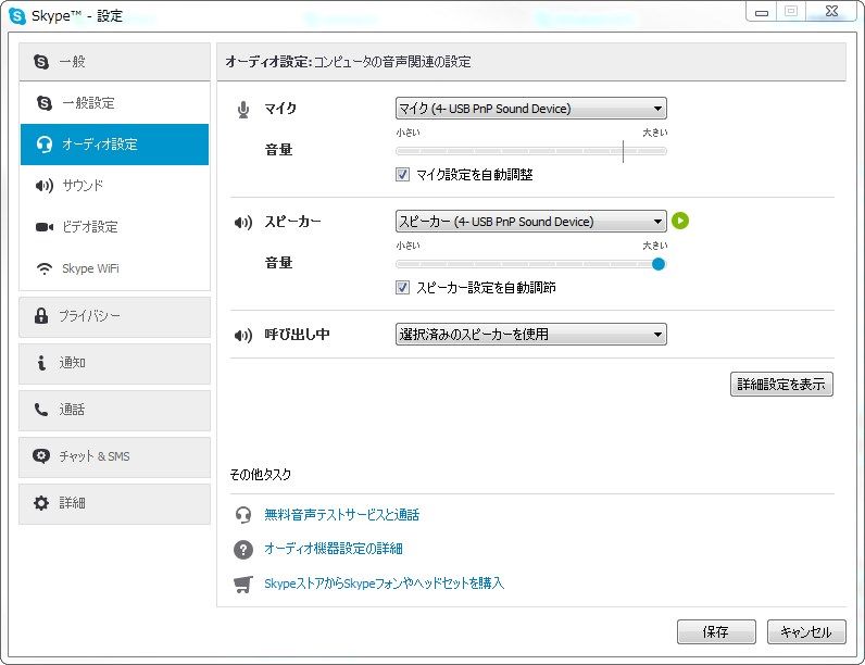 オーディオ設定のマイクとスピーカーを「4-USB PnP Sound Device」に選択します