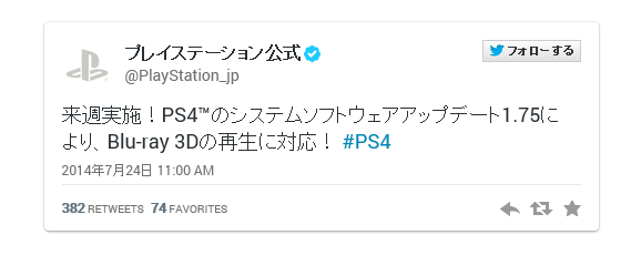 【PS4】来週のアップデートでBlu-ray3Dが再生できるようになるんだって! 2014年07月24日 カテゴリ:本体・周辺機器 Follow @maruhashi084 PS4ユーザーのみなさま、朗報ですよー!なんでも、来週のどこかでプレイステーション4にアップデート1.75が入ってBlu-ray3Dを再生できるようになるんだって!!!まだ詳しいことは発表されてないんですけどこれでより快適なPS4ライフを送れることは間違いないですよね(〃∇〃)後日追加発表があるそうなので、また詳しいことが分かり次第お届けしますーPlayStation 4 [Video Game]ソニー・コンピュータエンタテインメント2014-02-22Playstation 4 First Limited Pack (プレイステーション4専用ソフト KNACK ダウンロード用 プロダクトコード 同梱) [Video Game]ソニー・コンピュータエンタテインメント2014-02-22 タグ :#PS4#Blu-ray3D#アップデート 「本体・周辺機器」カテゴリの最新記事 コメント コメント一覧 (1) 1. sfod-1 2014年07月24日 21:51 この時を待っていた!! 借りるもの決めとこう! コメントする コメントフォーム 名前 コメント 記事の評価 リセット リセット 顔 星 情報を記憶 コメントを投稿する