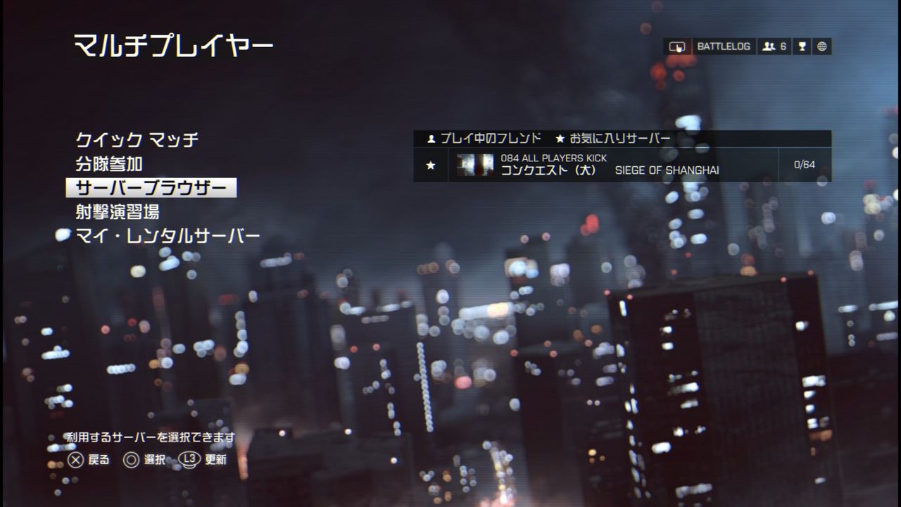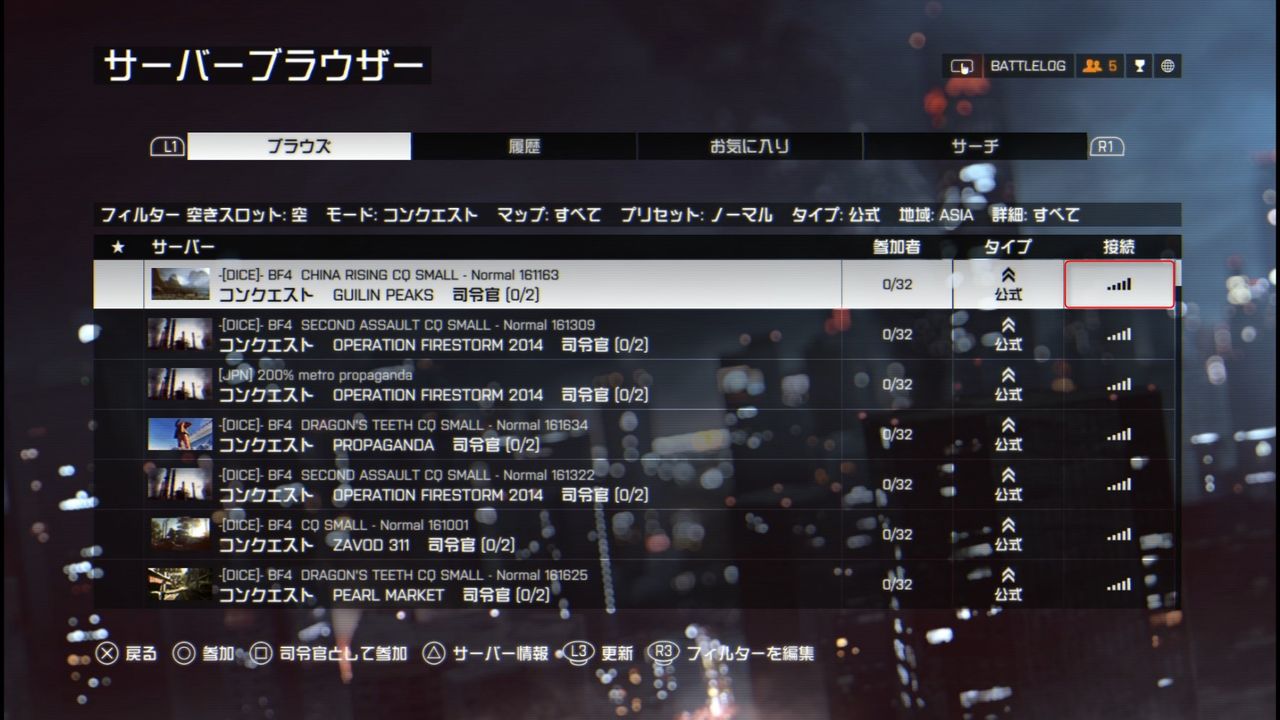 サーバーブラウザーからゲームモードを「コンクエスト」、空きスロットを「空」を選択