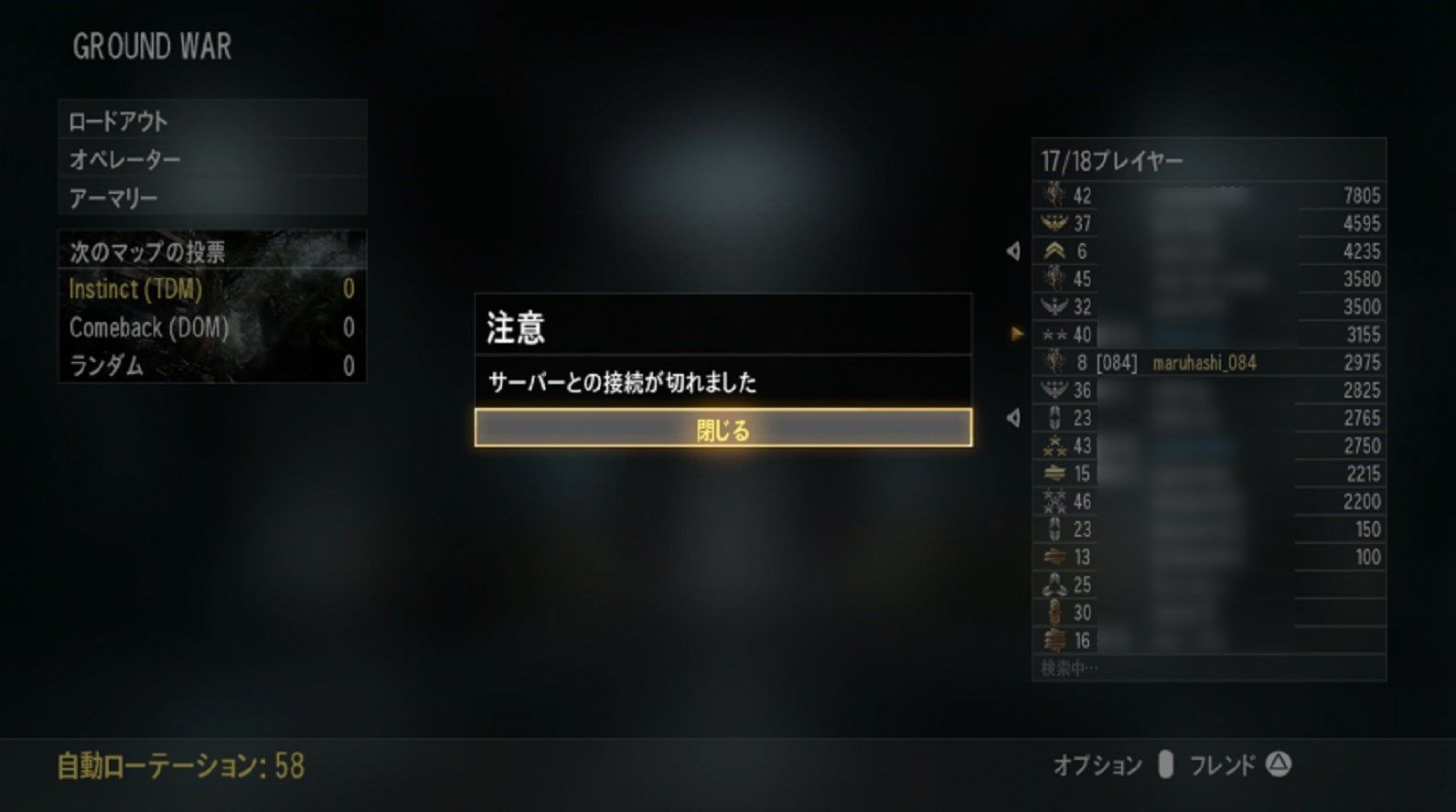 ゲーム開始時に自分だけ弾かれたり、ゲーム中のフリーズも稀になりますね