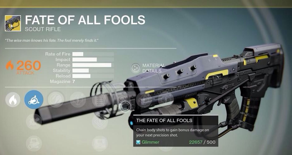 既に装備なんかもリークされていてこのエキゾチックスカウトライフル「フェイトオブフールズ」なんかが目玉賞品となりそうです