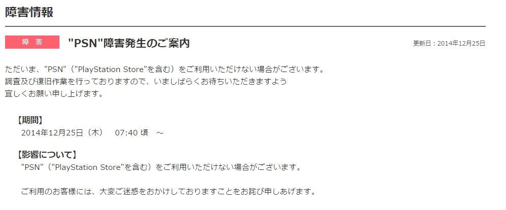 "PSN"障害発生のご案内ただいま、"PSN"("PlayStation Store"を含む)をご利用いただけない場合がございます。調査及び復旧作業を行っておりますので、いましばらくお待ちいただきますよう 宜しくお願い申し上げます。【期間】2014年12月25日(木) 07:40 頃 ~【影響について】"PSN"("PlayStation Store"を含む)をご利用いただけない場合がございます。 ご利用のお客様には、大変ご迷惑をおかけしておりますことをお詫び申しあげます。