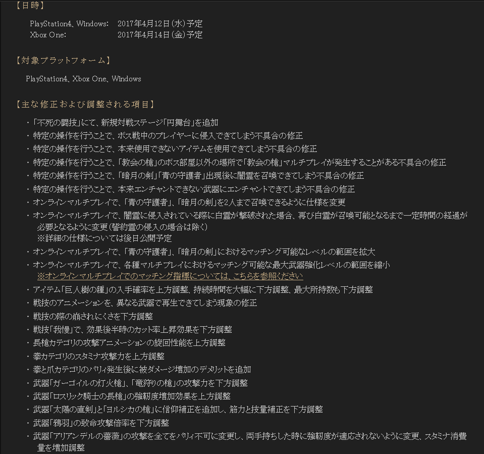 ・オンラインマルチプレイで、闇霊に侵入されている際に白霊が撃破された場合、再び白霊が召喚可能となるまで一定時間の経過が必要となるように変更(誓約霊の侵入の場合は除く)