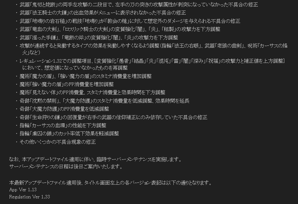 ・武器「竜血の大剣」、「ロスリック騎士の大剣」の変質強化「闇」、「炎」、「粗製」の攻撃力を下方調整