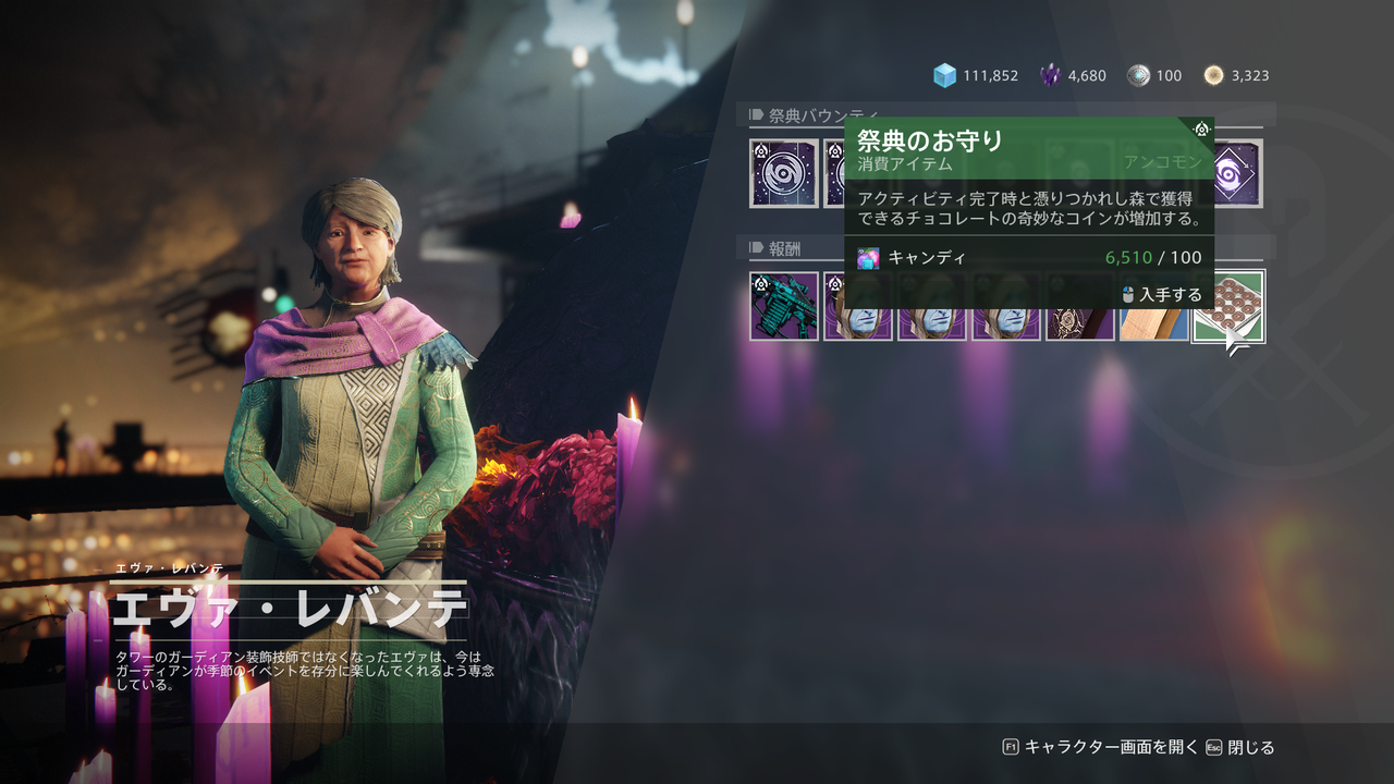 稲森さんが記事にされていた死者の祭りの隠し勝利の道のり「蜘蛛のビジョン」ですが、今週取得できるようになっています。色々な考察がされていたようですが、今週まで取得できなかったのはエヴァ・レバンテが今週から販売を開始した「祭典のお守り」が必要だからです。