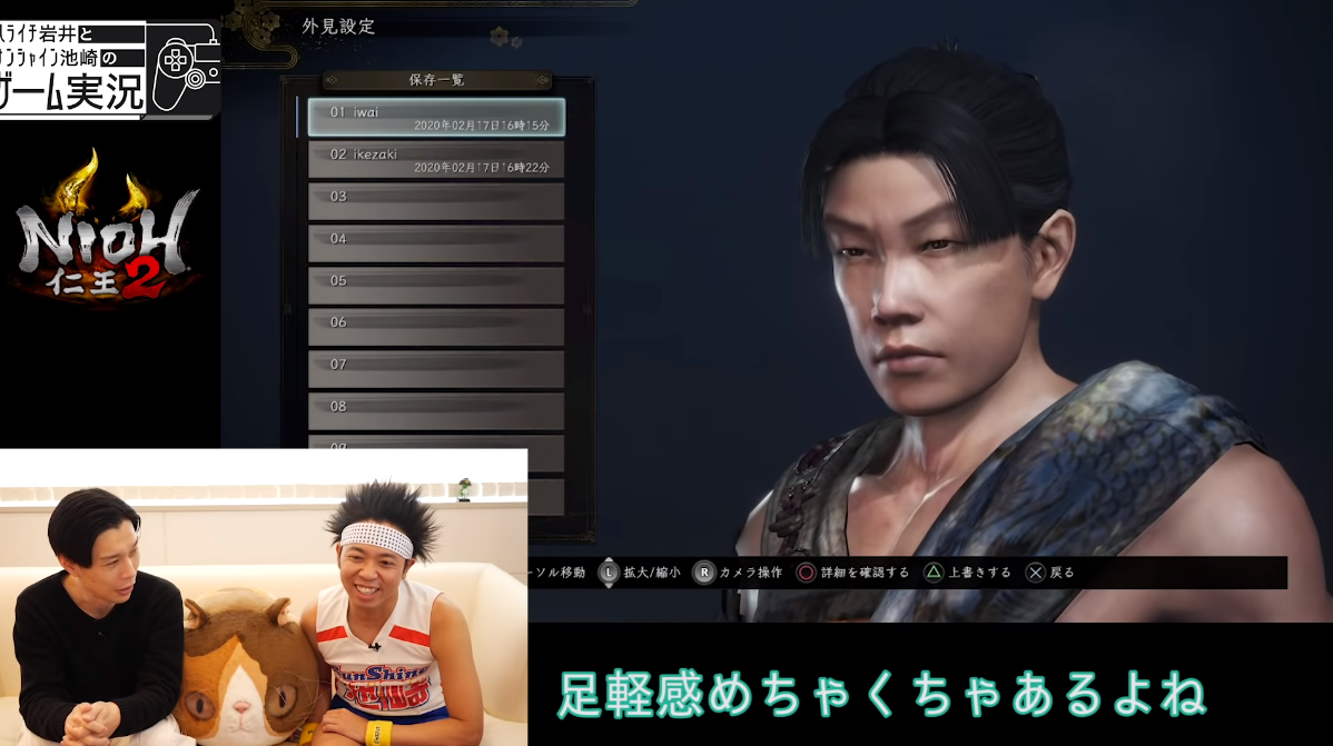 実況プレイに当たり2人に似せたキャラクターが用意された。仁王2の魅力のひとつはキャラクターカスタマイズの自由度にある。そんな自由度を活かして作られたハライチ岩井さんは本人も絶賛するほどそっくりに作られた。