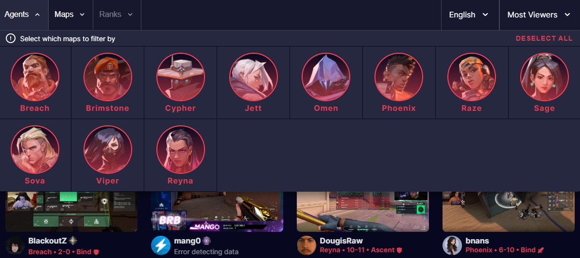operator.ggのタブのAgentやMapsから好きなエージェントやマップを選択すると、そのエージェントやマップをプレイしているストリーマーを絞り出してくれる。まだ、実装されていないが将来的にはランクで絞り込みすることもできる。