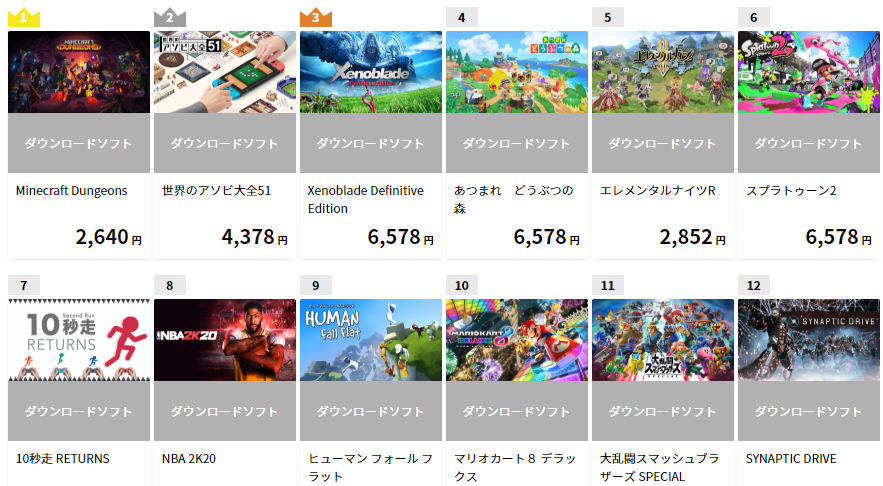 マインクラフトダンジョンズは国内でも人気が高く1位となっている。