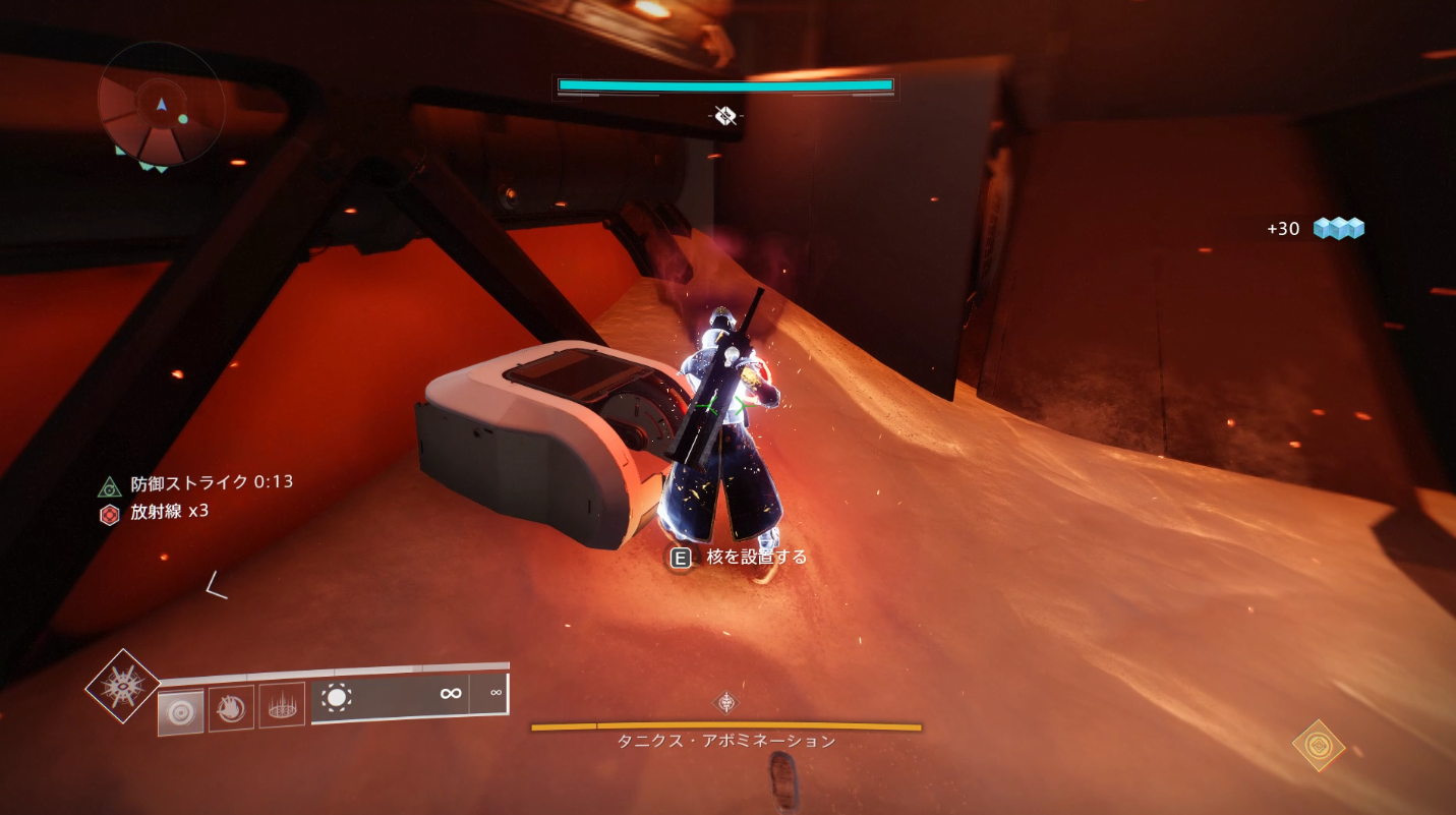 オペレーター、スキャナー、サプレッサーのバフがあります。3つのエリアに別れていてスポーン位置にオペレーター、青白く光るエリアにスキャナー、オレンジに光るエリアにサプレッサーを持ったバンダルが出現します。オペレーターは核運搬時に拘束されたプレイヤーの解除、スキャナーは核設置場所の確認、サプレッサーは3つあるセキュリティドローンの下からタニクスを怯ませます。オペレーターは拘束される可能性もあるので核を拾ってはいけません。タニクスに近づくと開始です。3ヵ所にわかれてバフを拾います。一定時間するとタニクスの車輪のようなものが光るので撃って壊します。壊すと核が落ちます。(1回あたり2個ずつの運搬がしやすいと思います。)核の運搬は距離がある場合は1人では運びきれないことがあるので2人1組で運搬するといいです。核を持っているプレイヤーは運ぶ以外は何もできないので受け取るプレイヤーが近くまで行きインタラクトして核を受け取ります。この間に、サプレッサーはタニクスが移動した場所へ行き3ヵ所のセキュリティドローンの下からタニクスを撃ち怯ませます。スキャナーは核設置場所を伝えます。4ヵ所に核を設置すると攻撃フェーズになります。