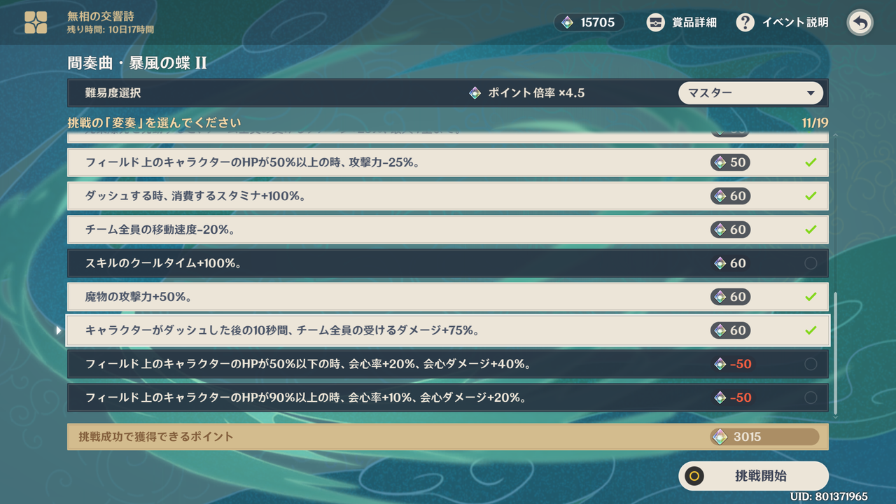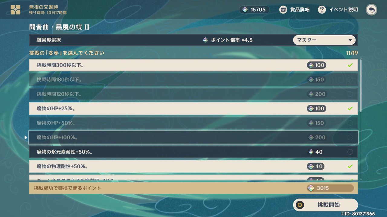 今回は原神のイベント「無相の交響詩」を紹介します。今回は5日目の「挑戦Ⅴ 間奏曲・暴風の蝶Ⅱ」を紹介します。2日目の「挑戦Ⅱ 間奏曲・暴風の蝶Ⅰ」と変奏が多少違うだけでステージなどの変更点はないと思います。