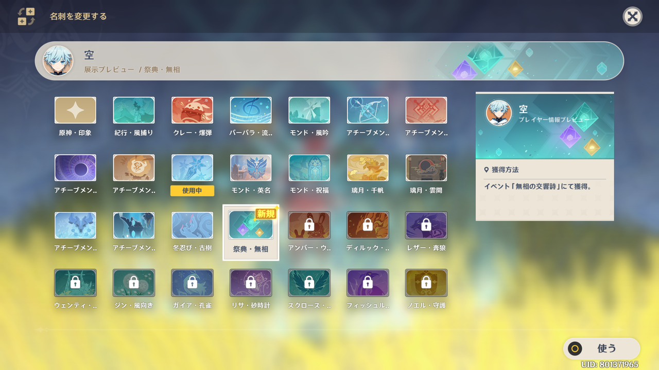 「無相の交響詩」にて累計14000ポイントを獲得すると名刺「祭典・無相」を取得することができます。毎日3000ポイント前後を目標にプレイされている方でしたら今日あたり取得できるはずです。