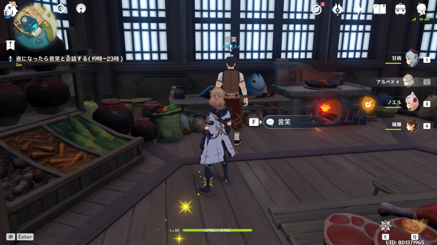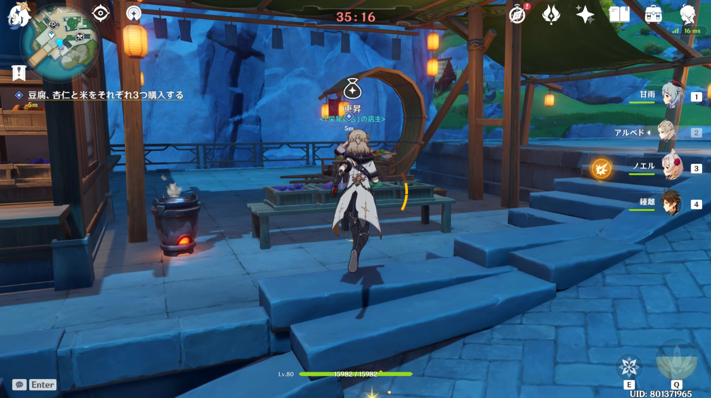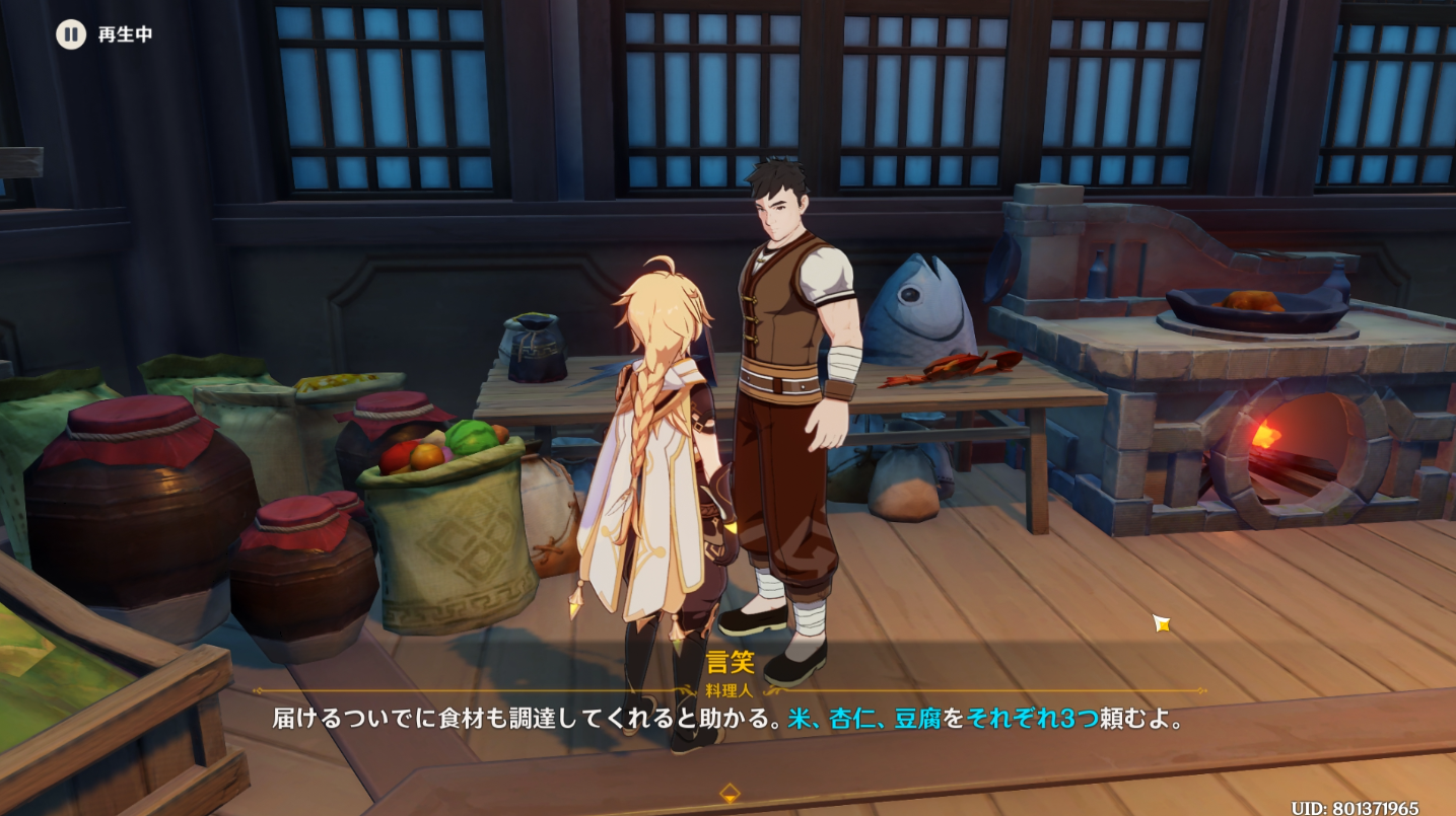 璃月港の栄発商店へ行き米、杏仁、豆腐をそれぞれ3つずつ購入します。ここでタイマーは終了するようです。
