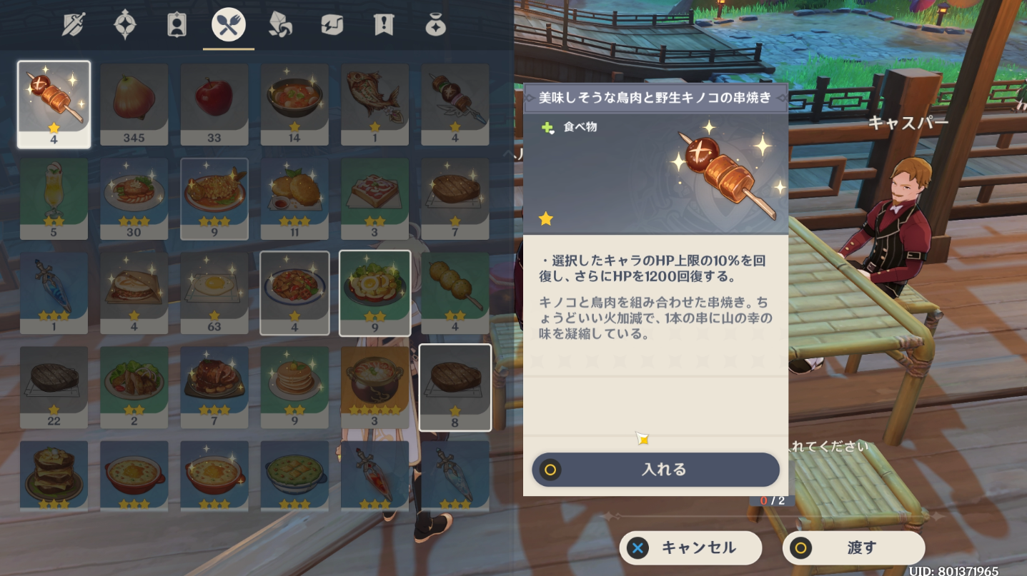 「美味しそうな鳥肉と野生キノコの串焼き」を2つ渡します。アイテムを受け取ったログが表示されなかったので自前で用意する必要があるかもしれません。