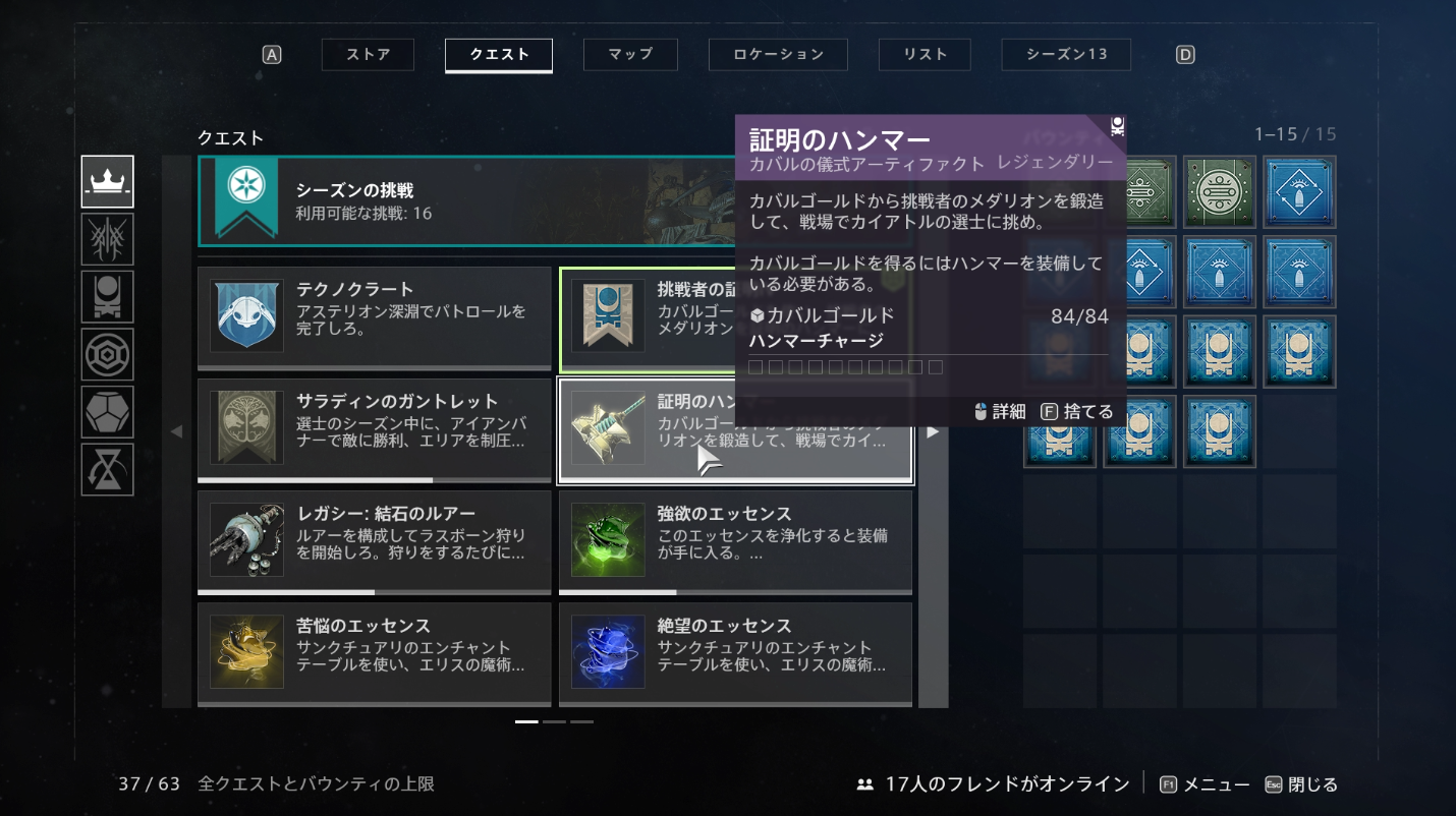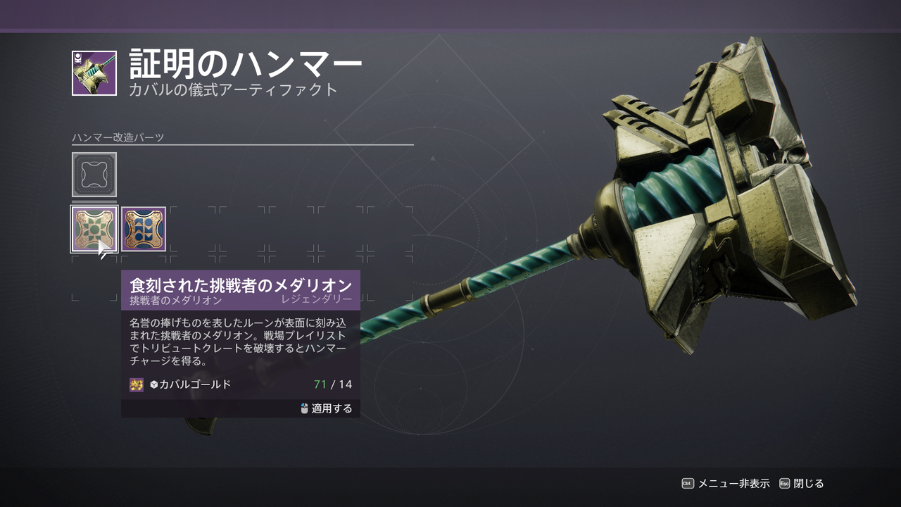 クエスト欄から証明のハンマーを選択してスロットにメダリオンを入れます。