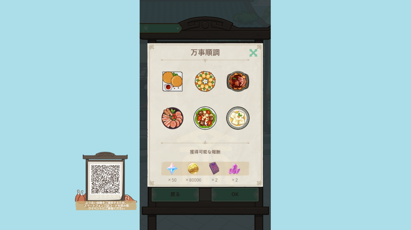 - イベントでは計9つの定食を選択することができ、定食ごとに6つの料理があります。調理を行って異なる定食を揃えると対応するゲーム内報酬を獲得できます。また、イベントで調理した料理もゲーム内メールにて配られます。