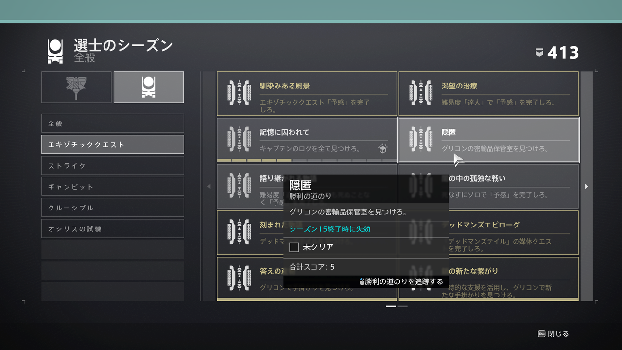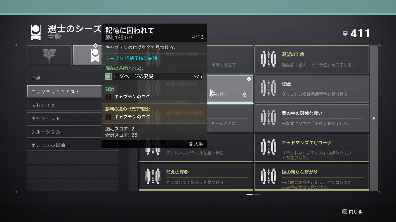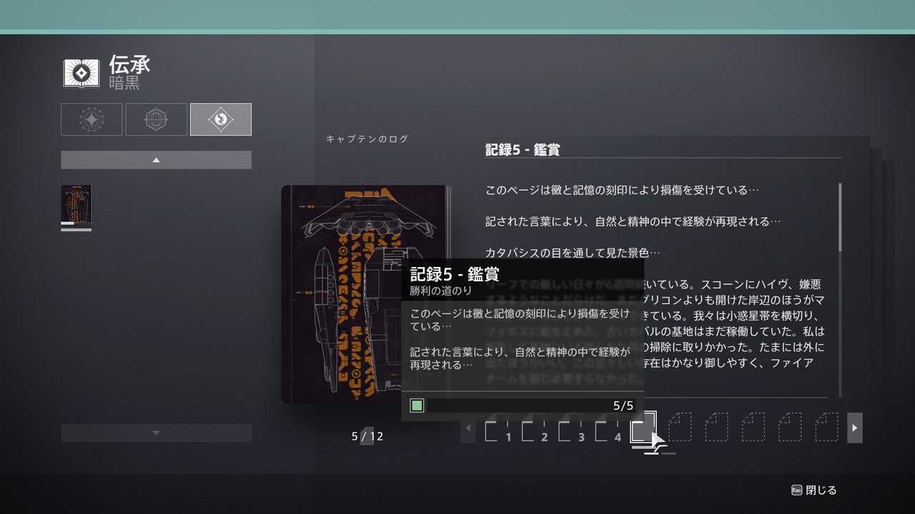 勝利の道のり「記憶に囚われて」と、その解除で取得できる伝承「キャプテンのログ」です。これも、まだ全て取得できないようです。週間の挑戦としてエキゾチッククエスト「予感」をクリアすると取得できます。