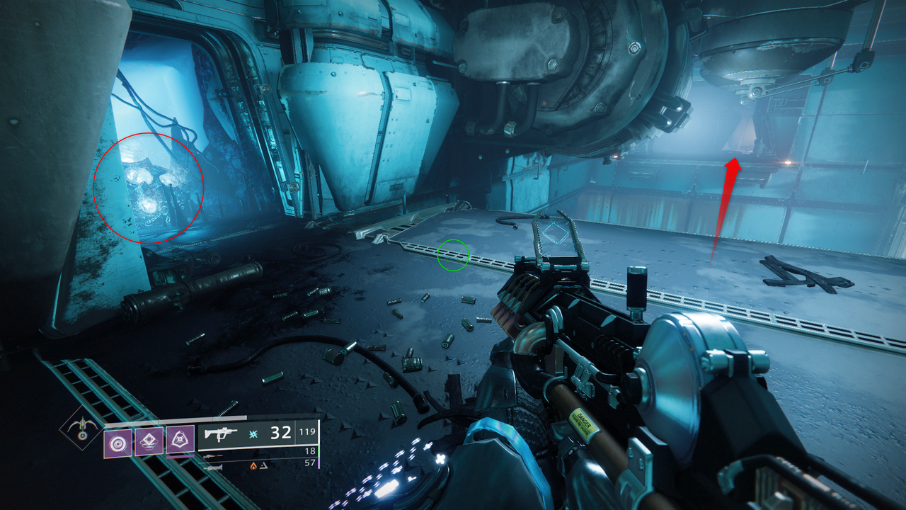 靄を抜けて下に降りた後にもう一度上に登ります。外には出ずに左方向の部屋へ入ります。(右側はバリアの2段目で、対岸へ渡ると柱に青い管があり、下へ行く扉が開くところです。)
