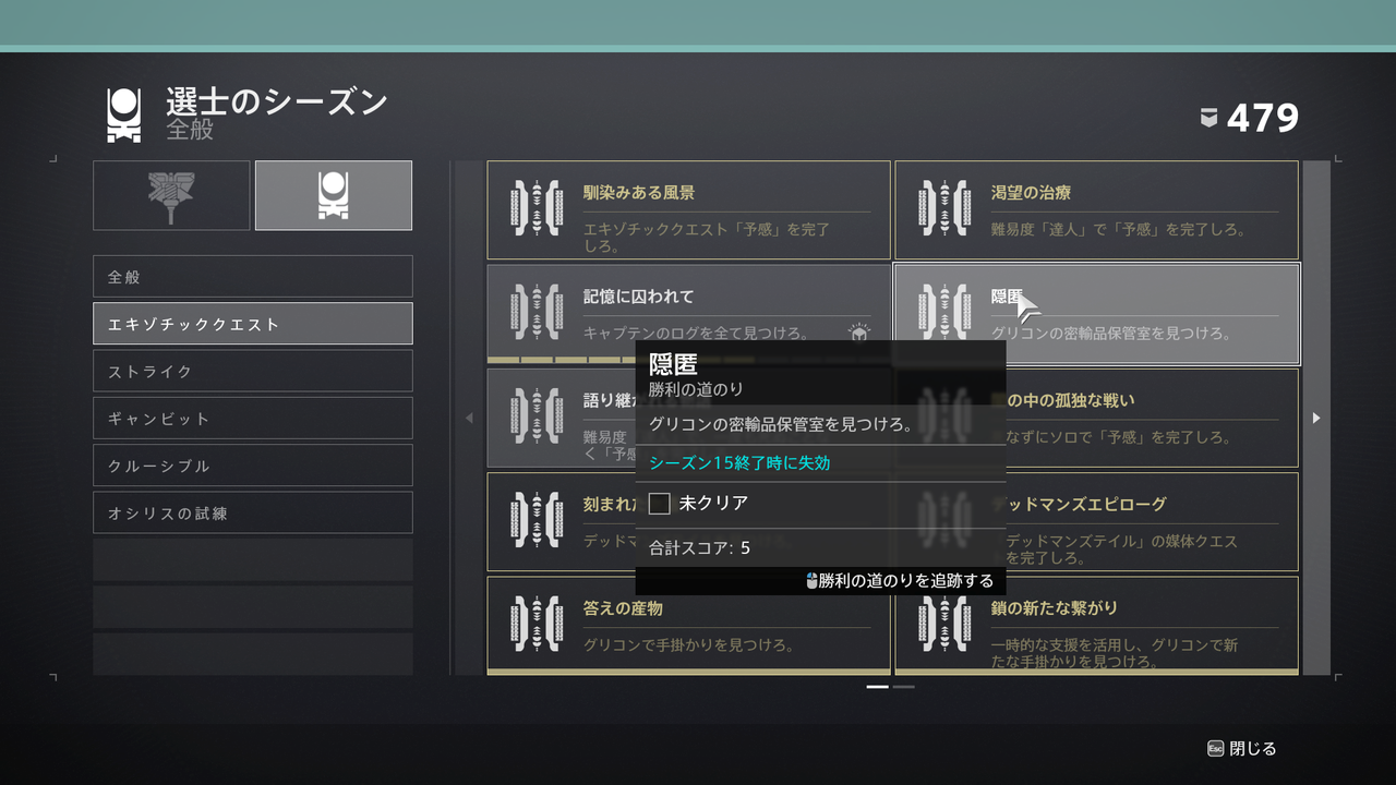 隠匿はグリコンの密輸品保管室を見つけろという内容です。チェックがついていませんが、どうやら週更新で毎週新しい密輸品保管室が追加され全て集めると解除されるようです。また、その週になって一度「予感」をクリアする必要があるようです。