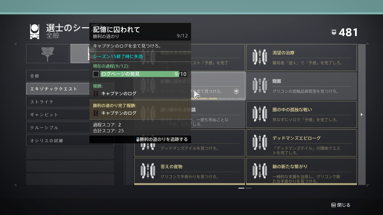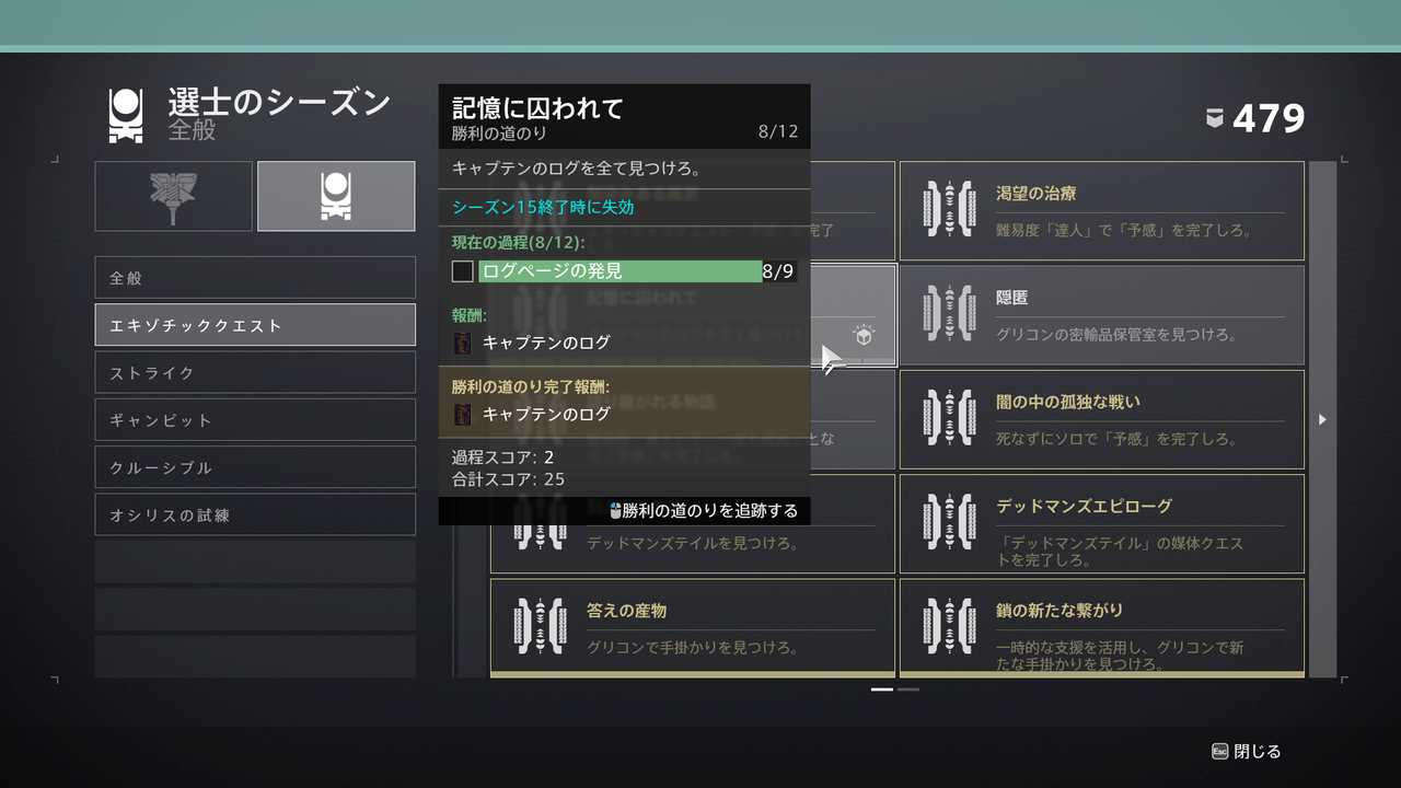 勝利の道のり「記憶に囚われて」と、その解除で取得できる伝承「キャプテンのログ」です。これも、まだ全て取得できないようです。週間の挑戦としてエキゾチッククエスト「予感」をクリアすると取得できます。