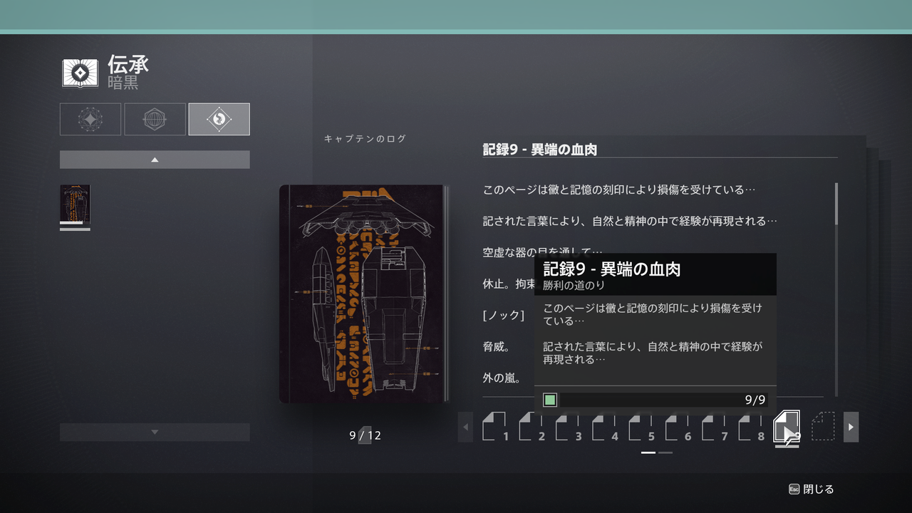 全部で12個あり、今週が9つ目であれば伝承「記録9-異端の血肉」が解除されます。