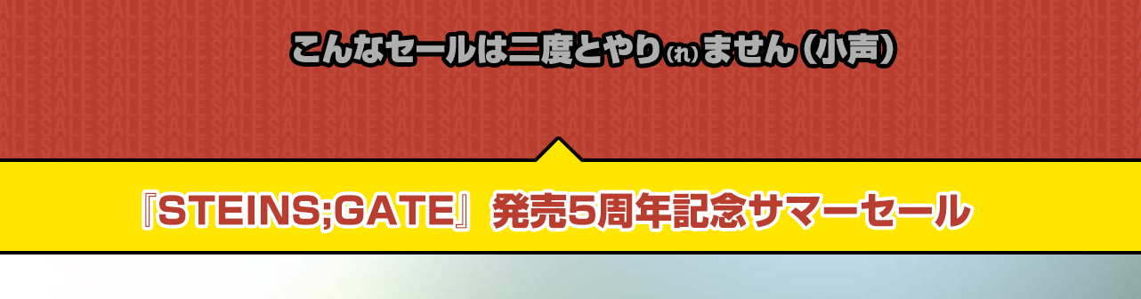 【シュタゲ5周年】5pbがシュタインズゲート発売5周年を記念して最大90%OFFのセールやるって! 2014年08月03日 カテゴリ:注目のゲーム Follow @maruhashi084 【【シュタゲ5周年】5pbがシュタインズゲート発売5周年を記念して最大90%OFFのセールやるって!】の続きを読む タグ :#シュタインズゲート#5pb.#セール#キャンペーン