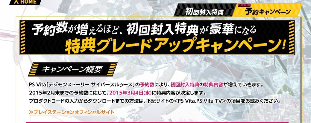 【デジモンストーリーサイバースルゥース】予約特典のキャンペーンが一段階グレードアップしてた件 2015年01月26日 カテゴリ:注目のゲーム Follow @maruhashi084 【【デジモンストーリーサイバースルゥース】予約特典のキャンペーンが一段階グレードアップしてた件】の続きを読む タグ :#デジモンストーリーサイバースルゥース#Vita#予約特典#キャンペーン